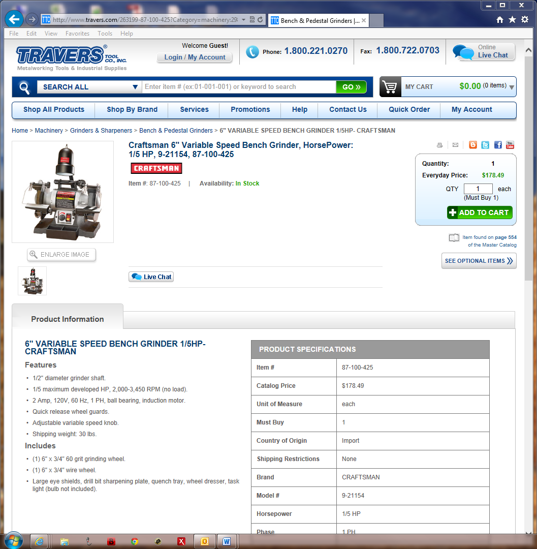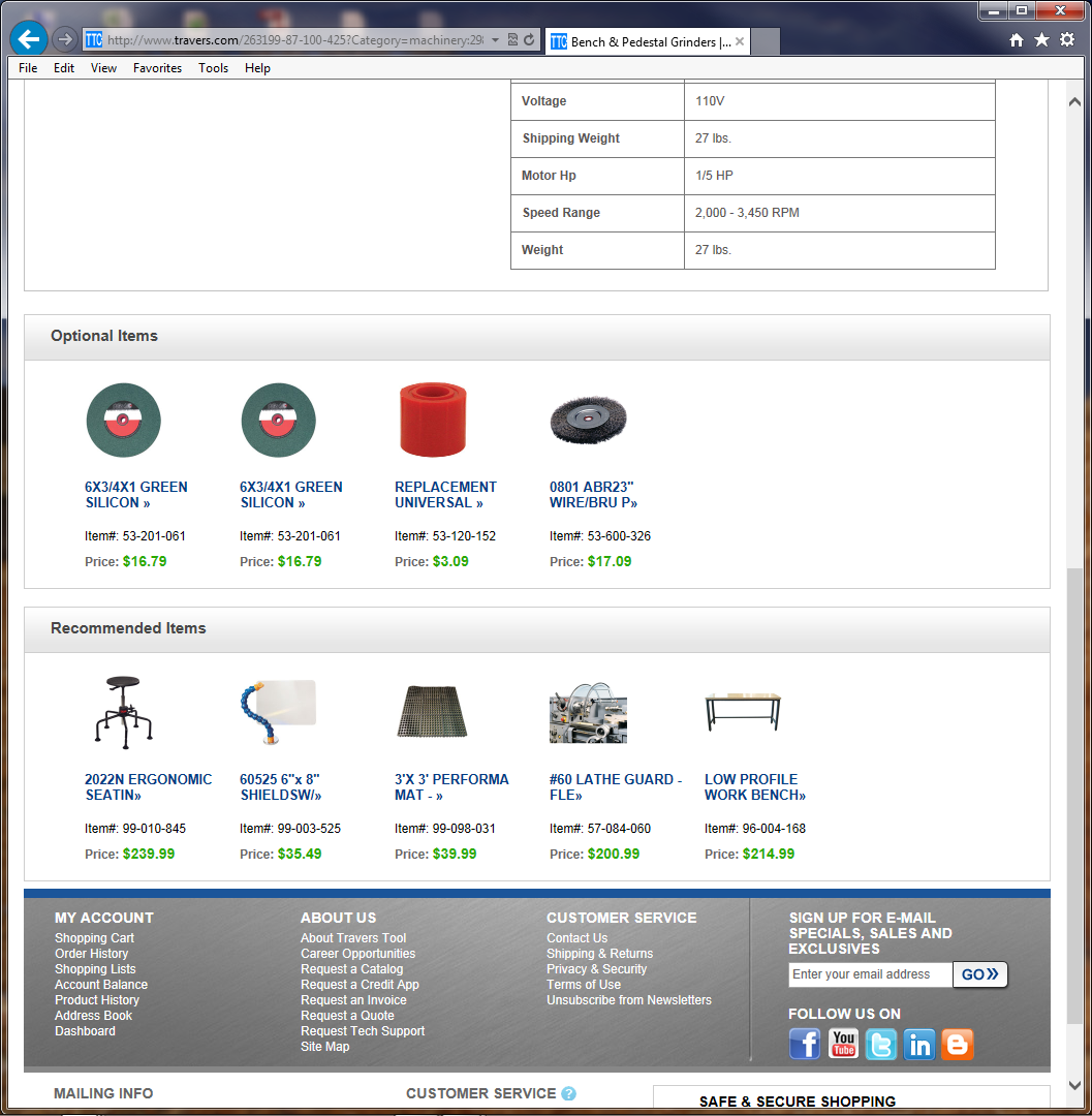 Let’s take a look at Travers Tool’s e-commerce site. They use dynamic natural language rules, executed in real-time to fill into two special blocks on a product page: Optional Items and Recommended Items. The first image is the top of the product page for a Craftsman Bench Grinder, and the second image shows the two special blocks lower on the page.