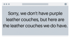 This user could have searched for leather couches in the first instance and spent a long time scrolling through the pages of results looking for any in purple. But by using messaging in this way, the user is informed immediately and is more likely to use the search system again.